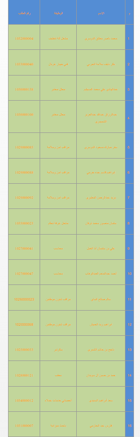 تعلن المؤسسة عن أسماء المقبولين الإحتياط على وظائف فرع المؤسسة بالخرج على بند الرواتب المقطوعة 105 ،  وسيتم تحديد موعد استكمال إجراءات التعيين عبر رسالة نصية sms على هواتفهم الشخصية :