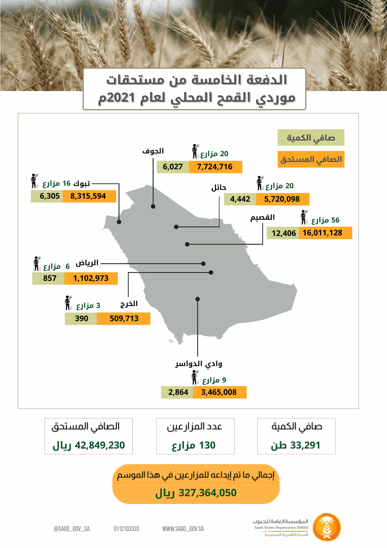 يذكر أن المؤسسة بدأت باستلام القمح المحلي من المزارعين للموسم الحالي اعتباراً من 22 شعبان 1442هـ، وقد بلغ إجمالي الكمية المستلمة من المزارعين حتى تاريخه (413.053) طن لعدد (1694) مزارع، وتحث المؤسسة المزارعين على أقفال حساباتهم فور الانتهاء من تسليم الكميات المخصصة لهم ليتسنى إيداع الدفعات التالية بحسب الكميات الموردة وبعد استكمال إجراءات التدقيق.