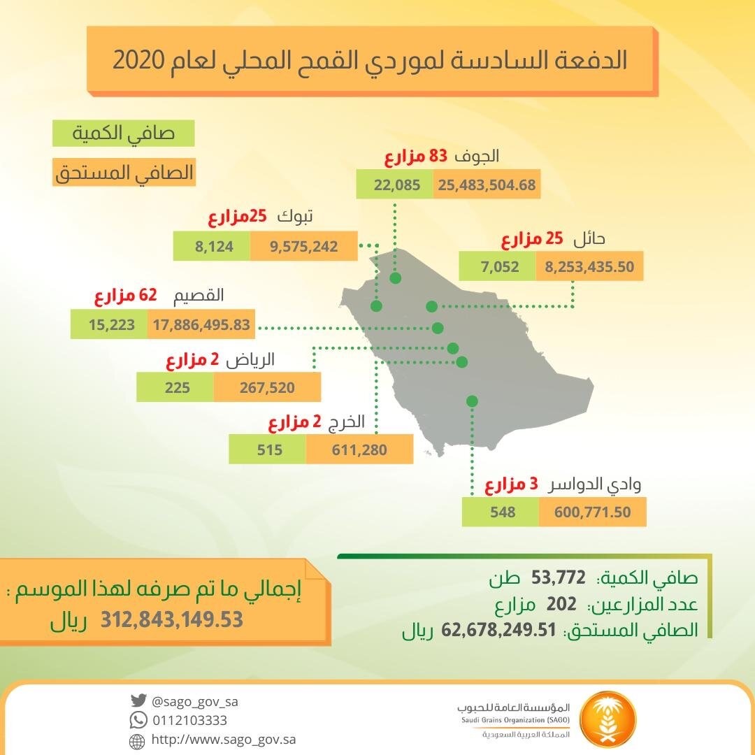 وقد بدأت المؤسسة باستلام القمح المحلي من المزارعين للموسم الحالي اعتباراً من 19/8/1441هـ، تنفيذا لقرار مجلس الوزراء رقم (66) بتاريخ 25 / 2 / 1437هـ المتضمن ضوابط إيقاف زراعة الأعلاف الخضراء، والقاضي بتكليف المؤسسة العامة للحبوب بشراء القمح من المزارعين المؤهلين في حال اختيارهم زراعة القمح، وذلك لمدة خمس سنوات وبكمية لا تتجاوز (700) ألف طن سنوياَ.