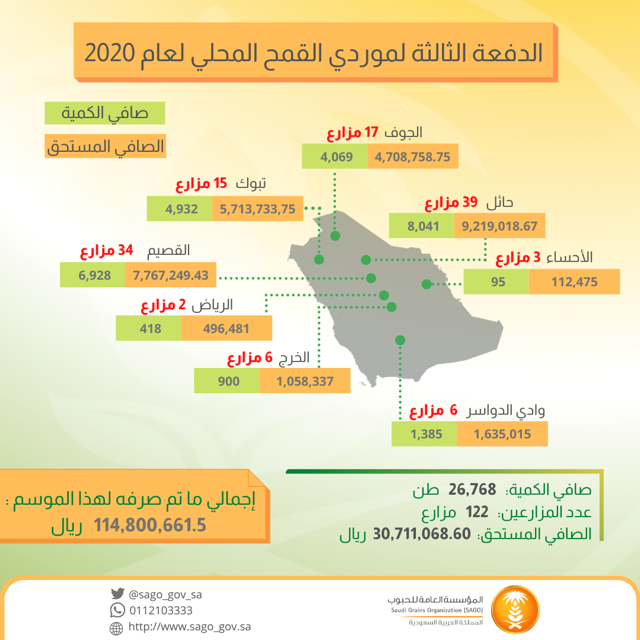 و قد بلغ اجمالي ما تم ايداعه لهذه الدفعة مبلغ (30,711,068.60) ريال بحساباتهم البنكية وذلك لعدد (122) مزارع. وبهذا يكون ما تمّ إيداعه مبلغ (114,800,661.5) ريال لعدد (481) مزارع بكمية  (99,193) طن، وسيتم إيداع الدفعات التالية بحسب الكميات الموردة وبعد استكمال إجراءات الاقفال والتدقيق.