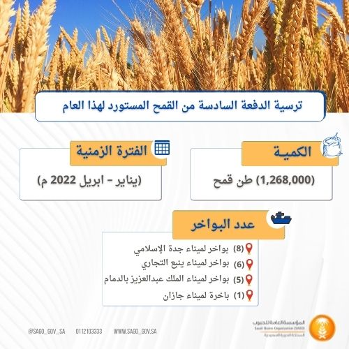 وبترسيه الدفعة السادسة لهذا العام (2021م) تكون المؤسسة قد تعاقدت منذ بداية هذا العام على كمية تقدر بنحو (3.4) مليون طن قمح مستورد، فيما تم شراء نحو (576) ألف طن قمح محلي من المزارعين لهذا الموسم، لتبلغ بذلك مشتريات المؤسسة من القمح هذا العام نحو (4) مليون طن، منها نحو (1.3) مليون طن سيتم توريدها بمشيئة الله خلال الأربع أشهر الأولى من العام المالي القادم، والذي يتزامن انتهاء فترة توريدها مع بداية موسم شراء القمح المحلي للموسم الجديد 2022م.