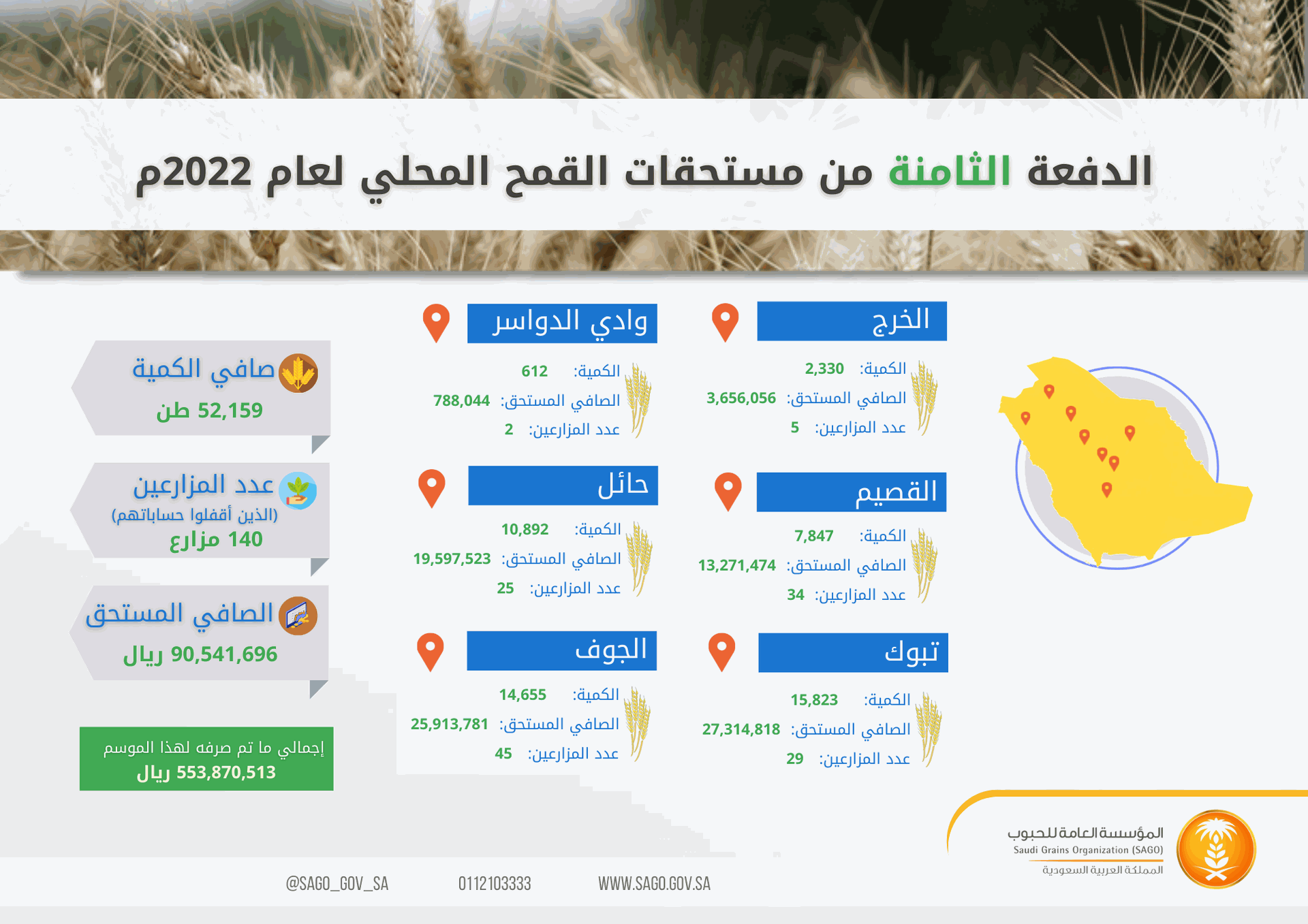 أعلنت المؤسسة العامة للحبوب عن صرف مستحقات الدفعة الثامنة من مزارعي القمح المحلي، شاملة الدفعة الرابعة من مستحقي العلاقة التعاقدية بين المزارعين والشركات الزراعية، اللذين قاموا بتوريد الكميات المخصصة لهم لهذا الموسم 1444/1443هـ، وأغلاق الحسابات عبر المنصة الإلكترونية "محصولي" على الموقع الرسمي للمؤسسة.