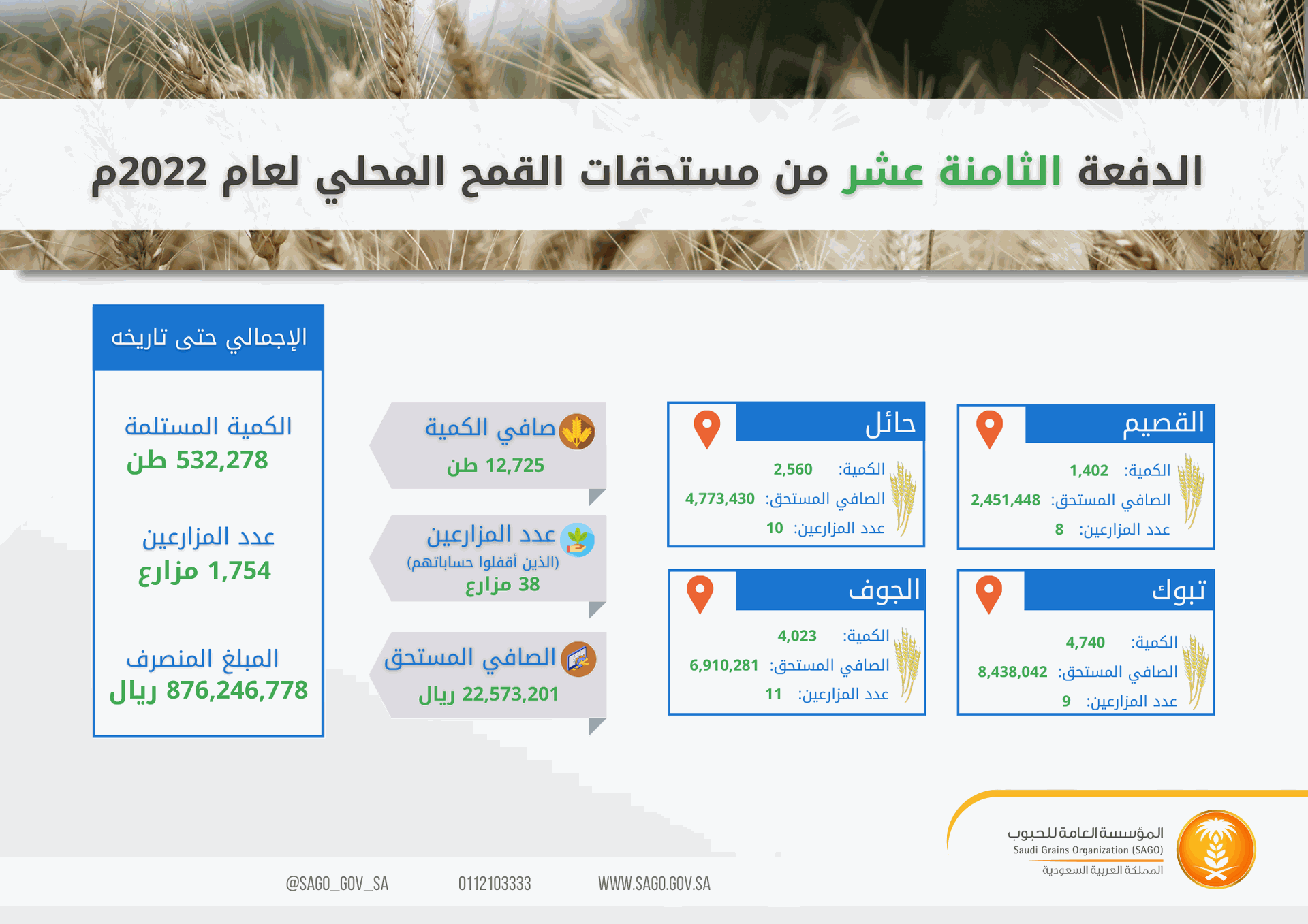 أعلنت المؤسسة عن صرف مستحقات الدفعة الثامنة عشر من مزارعي القمح المحلي، للذين قاموا بتوريد الكميات المخصصة لهم لهذا الموسم 1444/1443هـ، وأغلاق الحسابات عبر المنصة الإلكترونية "محصولي" على الموقع الرسمي للمؤسسة