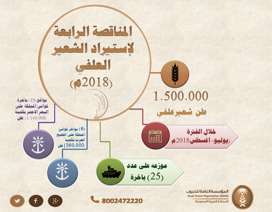 صرح معالى محافظ المؤسسة المهندس أحمد بن عبدالعزيز الفارس ان المؤسسة أعلنت اليوم عن مناقصتها الرابعة لهذا العام (2018م) لاستيراد كمية (1.500.000) طن شعير علفي للتوريد خلال الفترة (يوليو- اغسطس2018م) موزعه على عدد (25) باخرة بواقع (19) باخرة لموانئ المملكة على البحر الاحمر بكمية (1,140,000) طن و (6) بواخر لموانئ المملكة على الخليج العرب بكمية (360,000) طن.