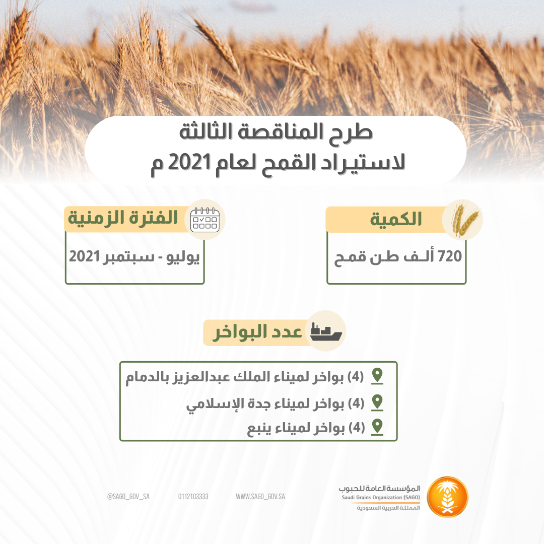 تعلن المؤسسة اليوم عن طرح المناقصة الثالثة لهذا العام لاستيراد كمية (720) ألف طن قمح للتوريد خلال الفترة (يوليو – سبتمبر2021).