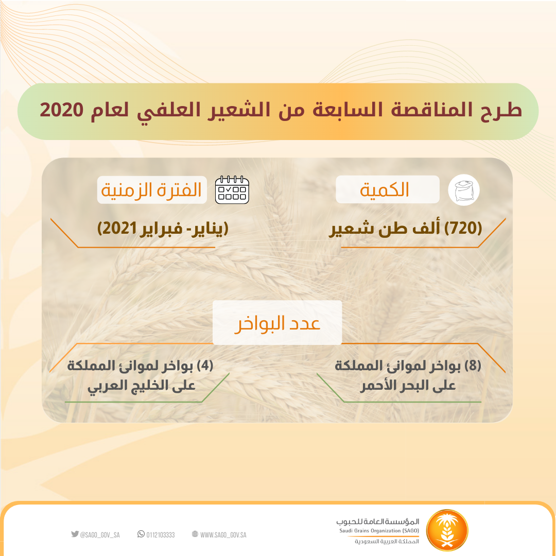 تعلن المؤسسة عن طرحها المناقصة السابعة هذا العام (2020م) لاستيراد كمية (720) ألف طن شعير علفي للتوريد خلال الفترة (يناير - فبراير 2021م).