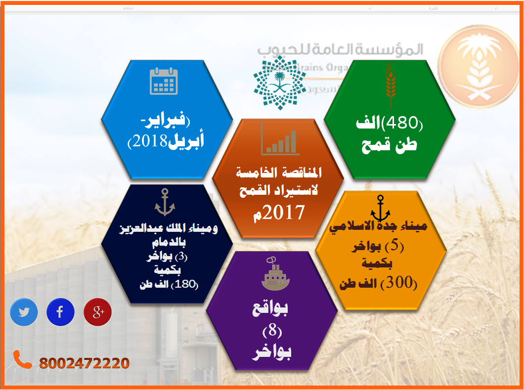 صرح معالى محافظ المؤسسة المهندس أحمد بن عبدالعزيز الفارس ان المؤسسة أعلنت اليوم عن مناقصتها الخامسة لهذا العام (2017م) لاستيراد كمية ((480الف طن قمح للتوريد خلال الفترة (فبراير- أبريل2018) بواقع (8) بواخر موزعة على ميناء جدة الاسلامي (5) بواخربكمية (300) الف طن ، وميناء الملك عبدالعزيز بالدمام (3) بواخر بكمية (180) الف طن.