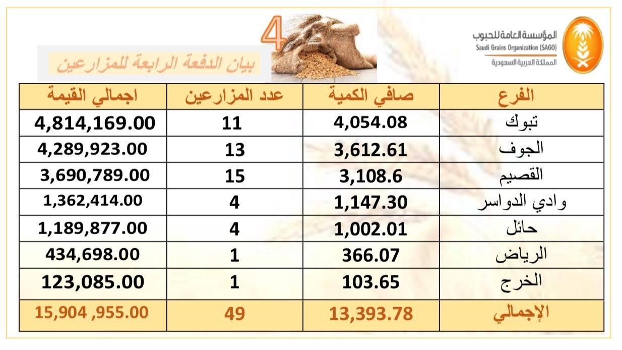 بدأت المؤسسة بإيداع قيمة الدفعة الرابعة لشراء القمح المحلي من المزارعين المحليين الذين قاموا بتوريد محصولهم من القمح واقفلوا حساباتهم واستكملوا إجراءاتهم لموسم (1440 /1441هـ) ولا يوجد عليهم مديونيات للصندوق التنمية الزراعية او صندوق التنمية العقاري.