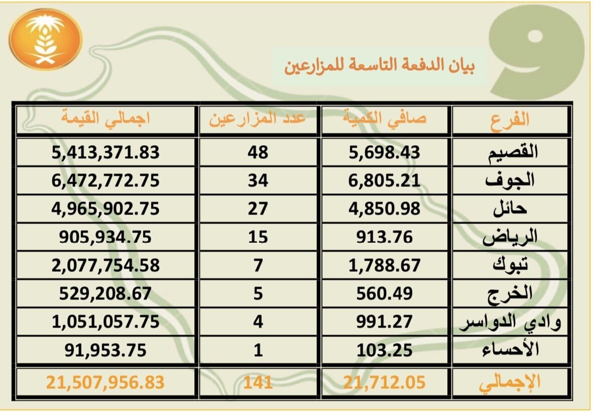 وقد بلغ اجمالي ما تم ايداعه لهذه الدفعة مبلغ (21,507,956.83) ريال بحساباتهم البنكية وذلك لعدد (141) مزارعاً.