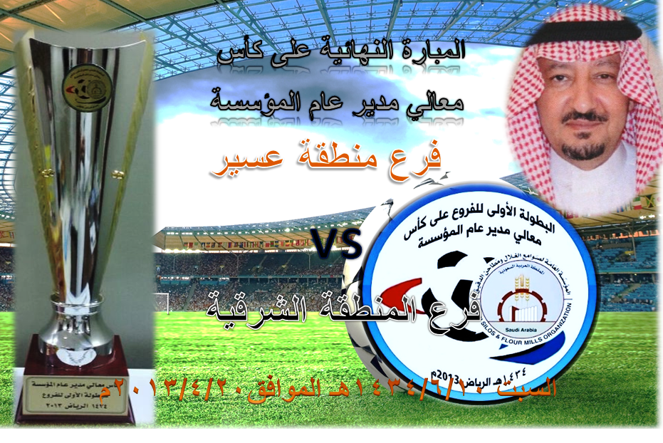 ضمن البطولة الاولى على مستوى الفروع للمؤسسة العامة لصوامع الغلال ومطاحن الدقيق تقام المباراة النهائية على شرف معالي مدير عام المؤسسة المنهدس / وليد بن عبدالكريم الخريجي وذلك بين فريق المنطقة الشرقية وفريق منطقة عسير مساء هذا اليوم 10/06/1434هـ بعد فوز الاول على فريق منطقة تبوك وفوز الفريق الثاني على فريق منطقة مكة المكرمة. وقد اجريت قرعة الثالث والرابع وضفر بالمركز الثالث فريق مكة المكرمة.