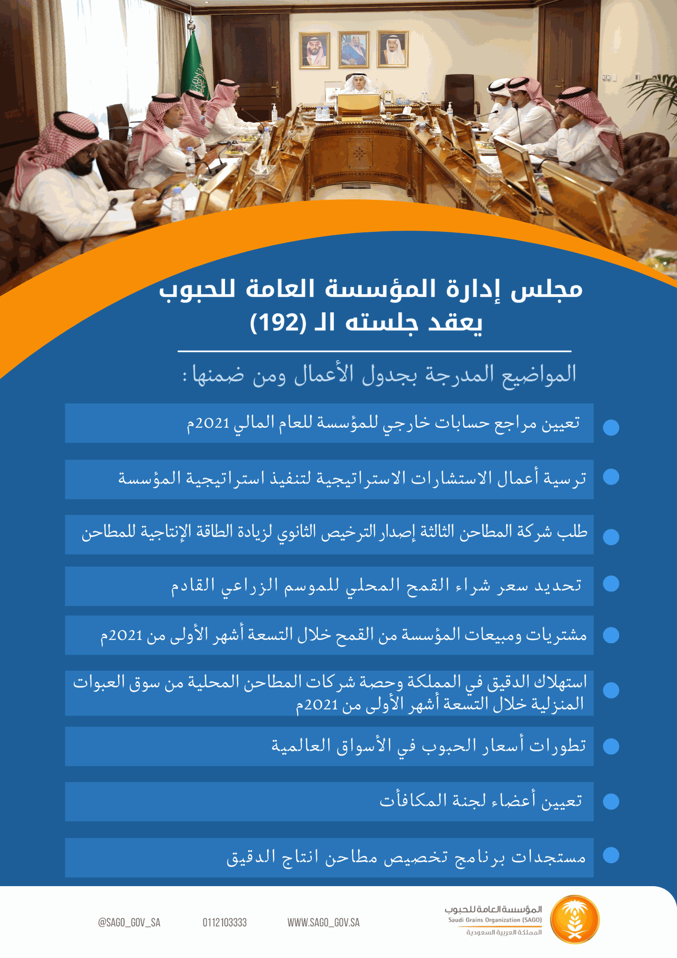 عقد مجلس إدارة المؤسسة العامة للحبوب في جلسته (192) بتاريخ 21/10/2021م برئاسة معالي وزير البيئة والمياه والزراعة رئيس مجلس إدارة المؤسسة المهندس/ عبدالرحمن بن عبدالمحسن الفضلي.