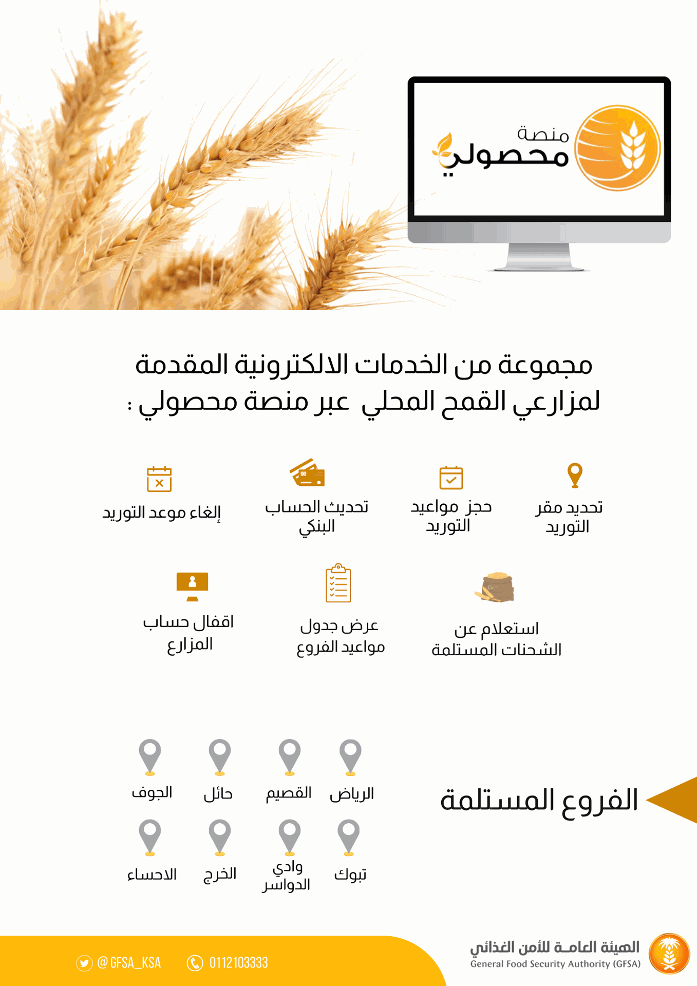 تعلن الهيئة عن تفعيل خدمة حجز المواعيد من خلال منصة "محصولي" لاستلام القمح المحلي للموسم الزراعي 1445/1444هـ (2023م)، تمهيداً لبدء موسم الاستلام اعتباراً من يوم الأحد 1444/8/27هـ الموافق 2023/3/19م.