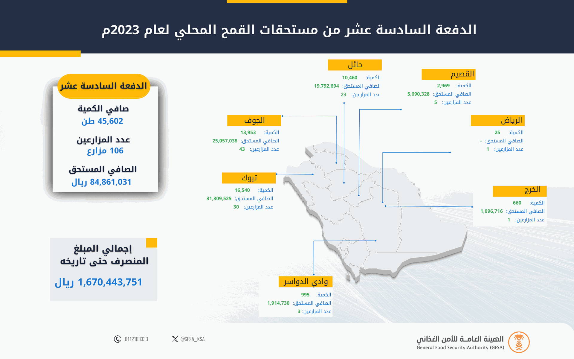تعلن الهيئة عن صرف مستحقات الدفعة السادسة عشر لمزارعي القمح المحلي، شاملة دفعة مستحقي العلاقة التعاقدية بين (المزارعين والشركات الزراعية)، اللذين قاموا بتوريد الكميات المخصصة لهم لهذا الموسم 1445/1444هـ (2023م)، وأغلاق حساباتهم عبر المنصة الالكترونية "محصولي" على الموقع الرسمي للهيئة.